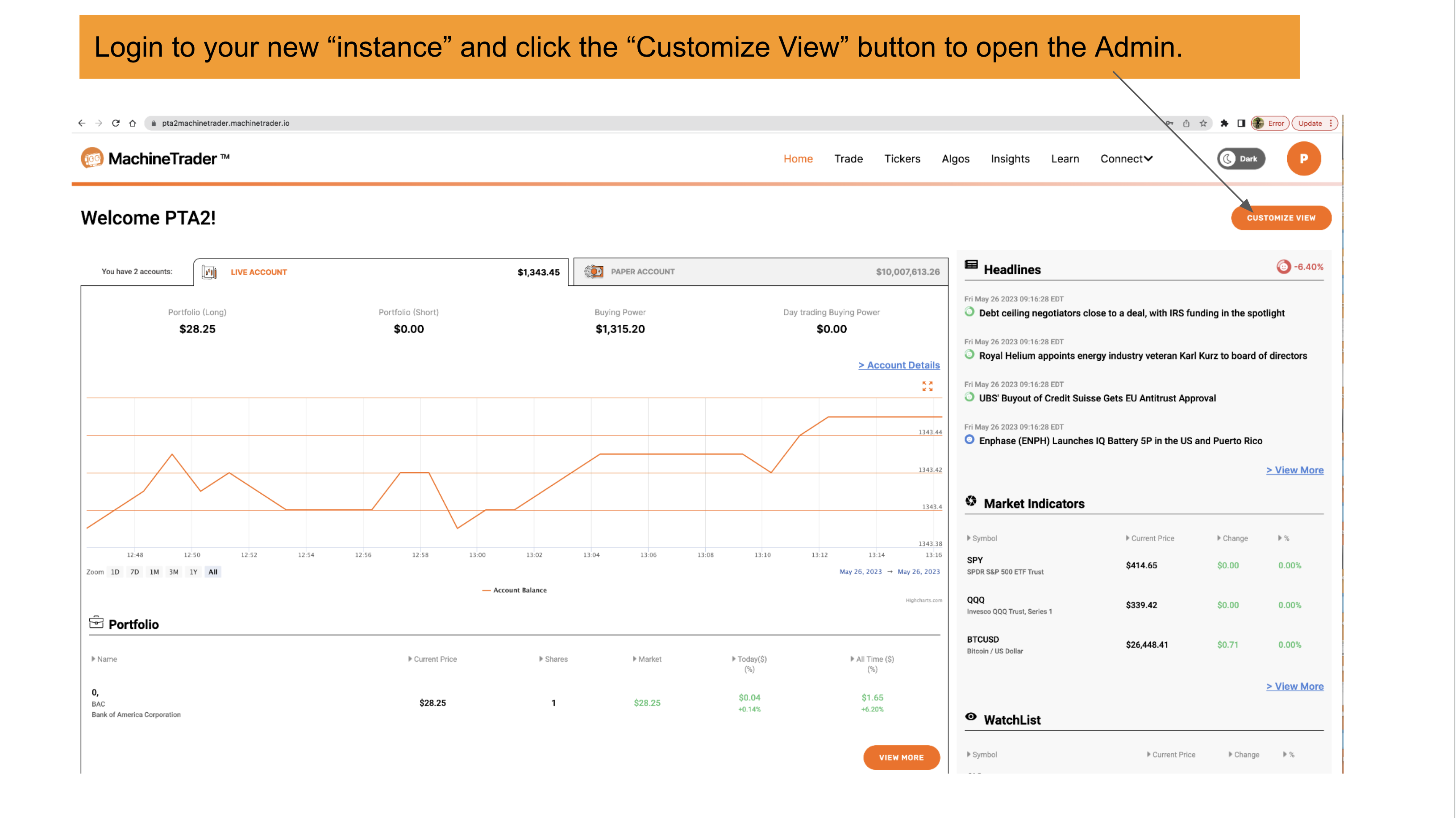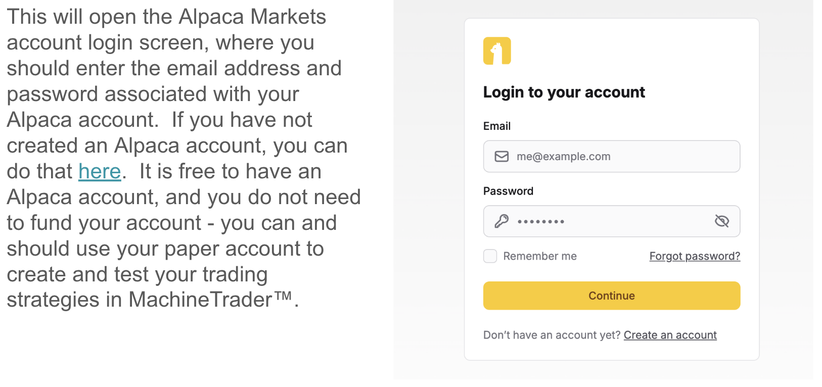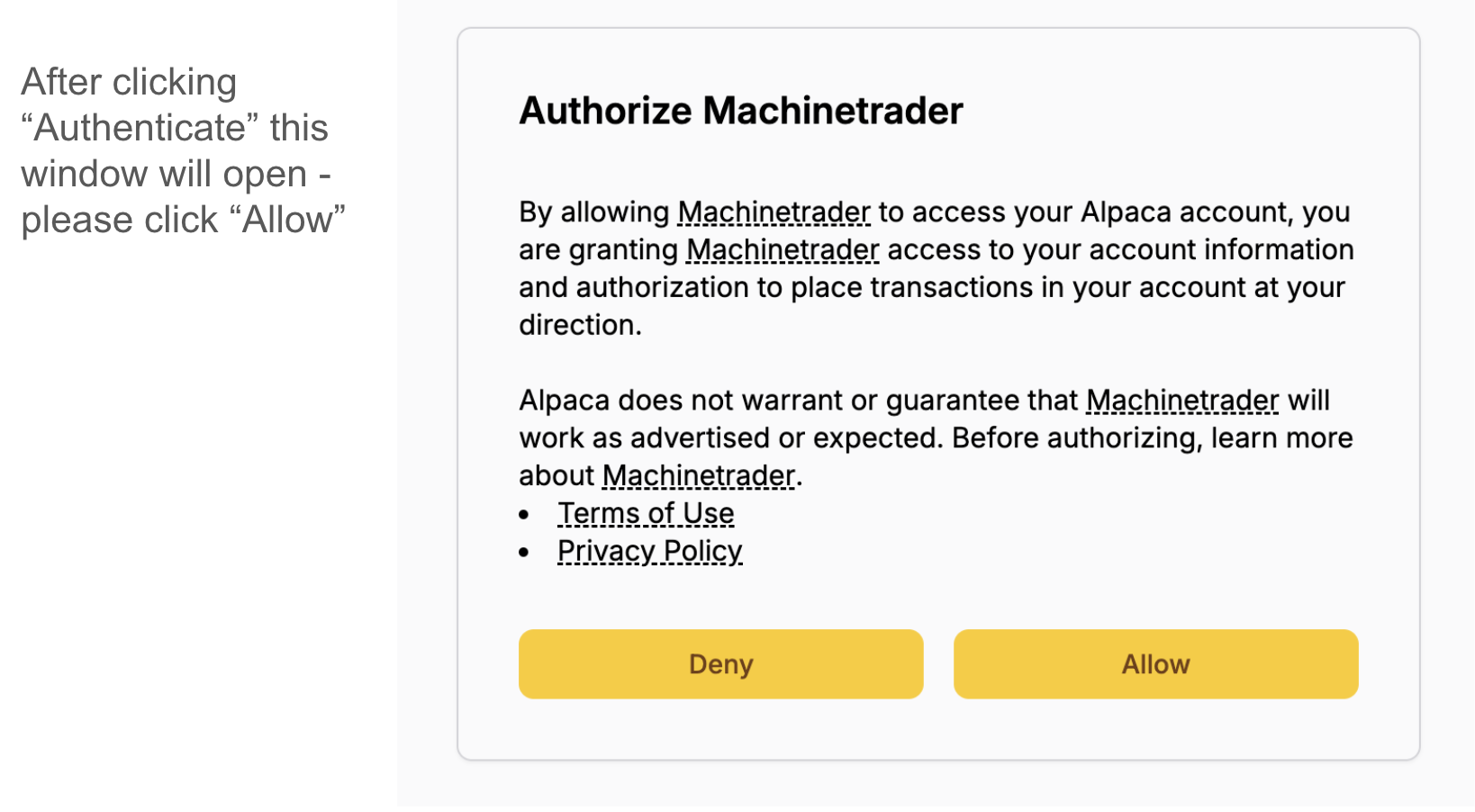 Once you sign up for a MachineTrader trading account, you will receive access to your own "instance" on AWS Cloud. After you log in to your account, navigate to the "Home Page" in order to authorize your Alpaca account.